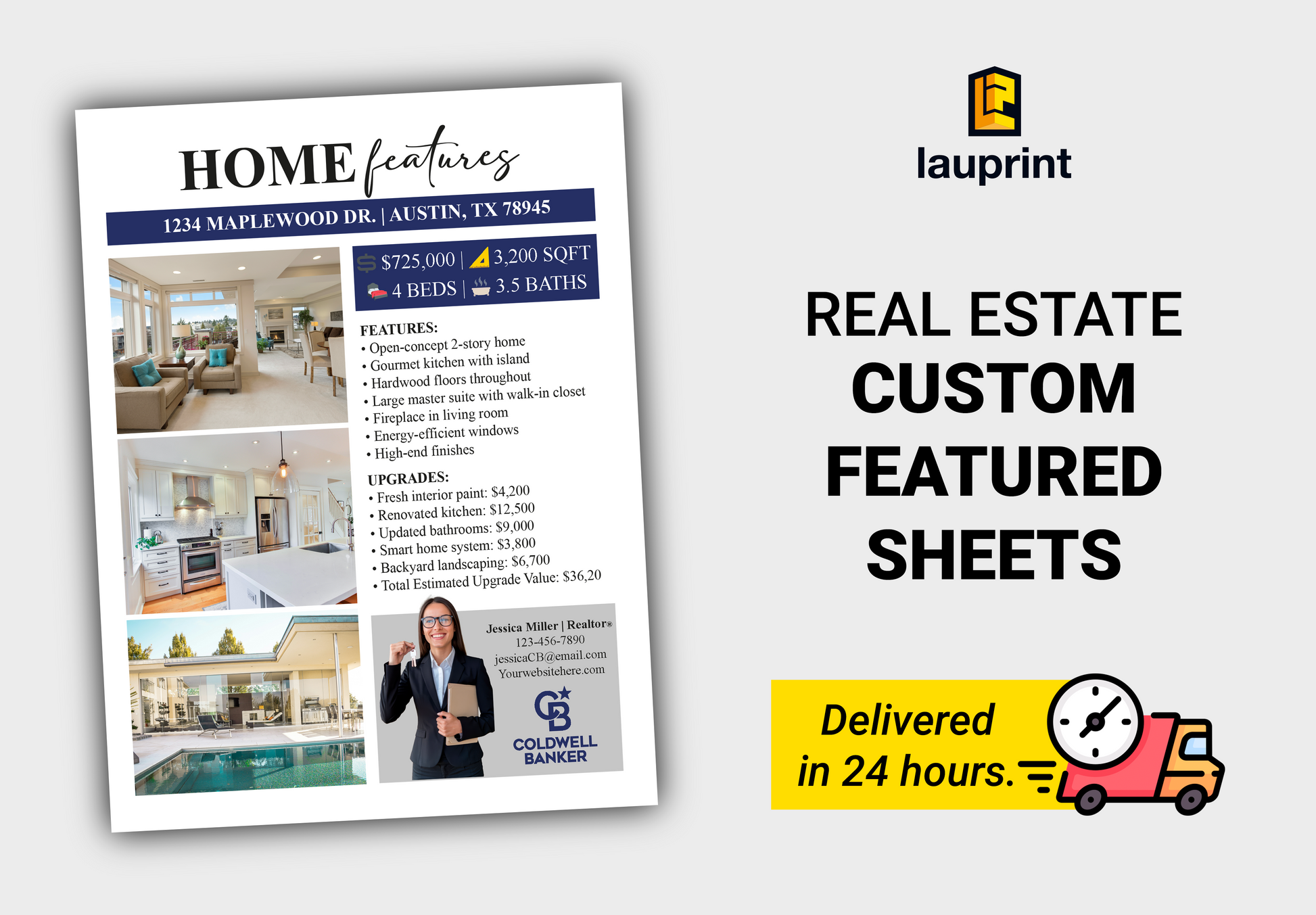 Professional photos and print material increase the value of your property. Good quality printing tells a story of the listing and a lot about you! This feature sheet is 8.5" x 11" two-sided. Choose 100lb gloss paper stock or 10pt card stock