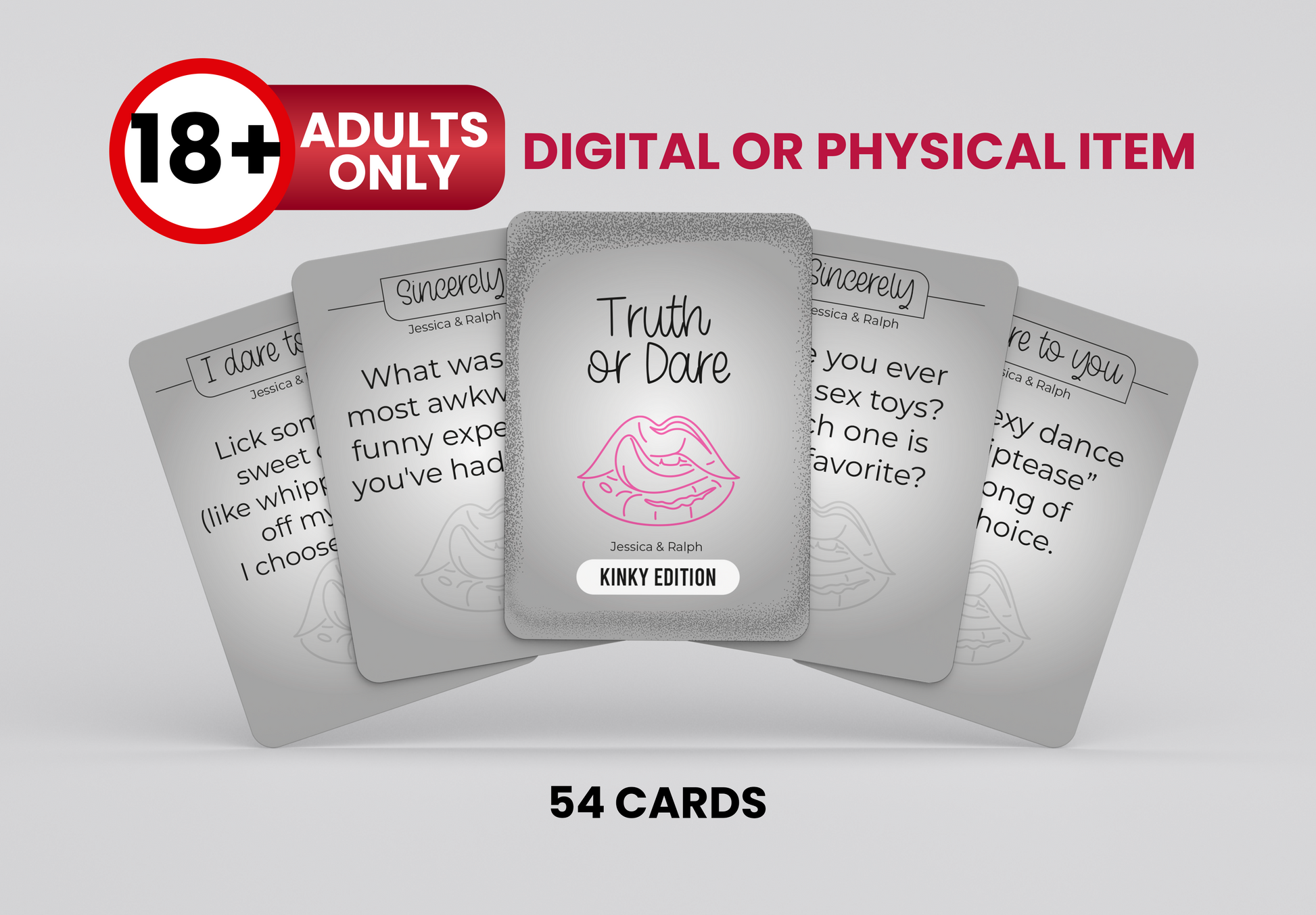 Take your date nights to the next level with this steamy and exciting Truth or Dare card game for couples! Whether you're looking to deepen your connection, add some laughter, or turn up the heat, these 54 daring cards will keep things fun, flirty, and full of surprises.