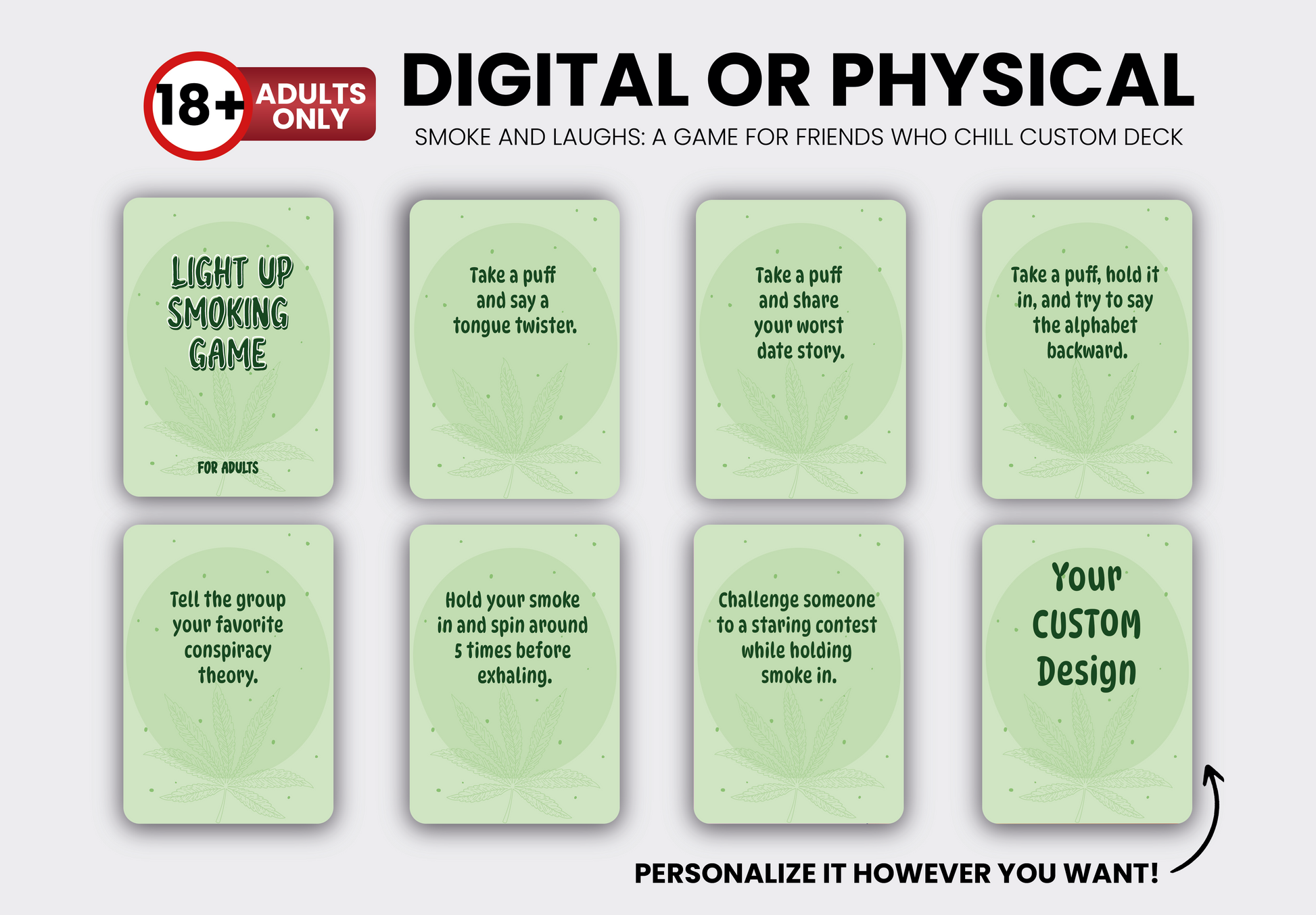 Rush of Smoke and Nighttime Fun is the ultimate card game designed for smokers who love to unwind, laugh, and enjoy memorable moments under the lights. With a mix of fun challenges, unique dares, and a relaxed atmosphere, this game transforms every smoke break into an unforgettable experience. Whether you’re hanging out with friends or enjoying a chill night, this game creates the perfect vibe for good times and great company. Light up, play, and let the fun begin!